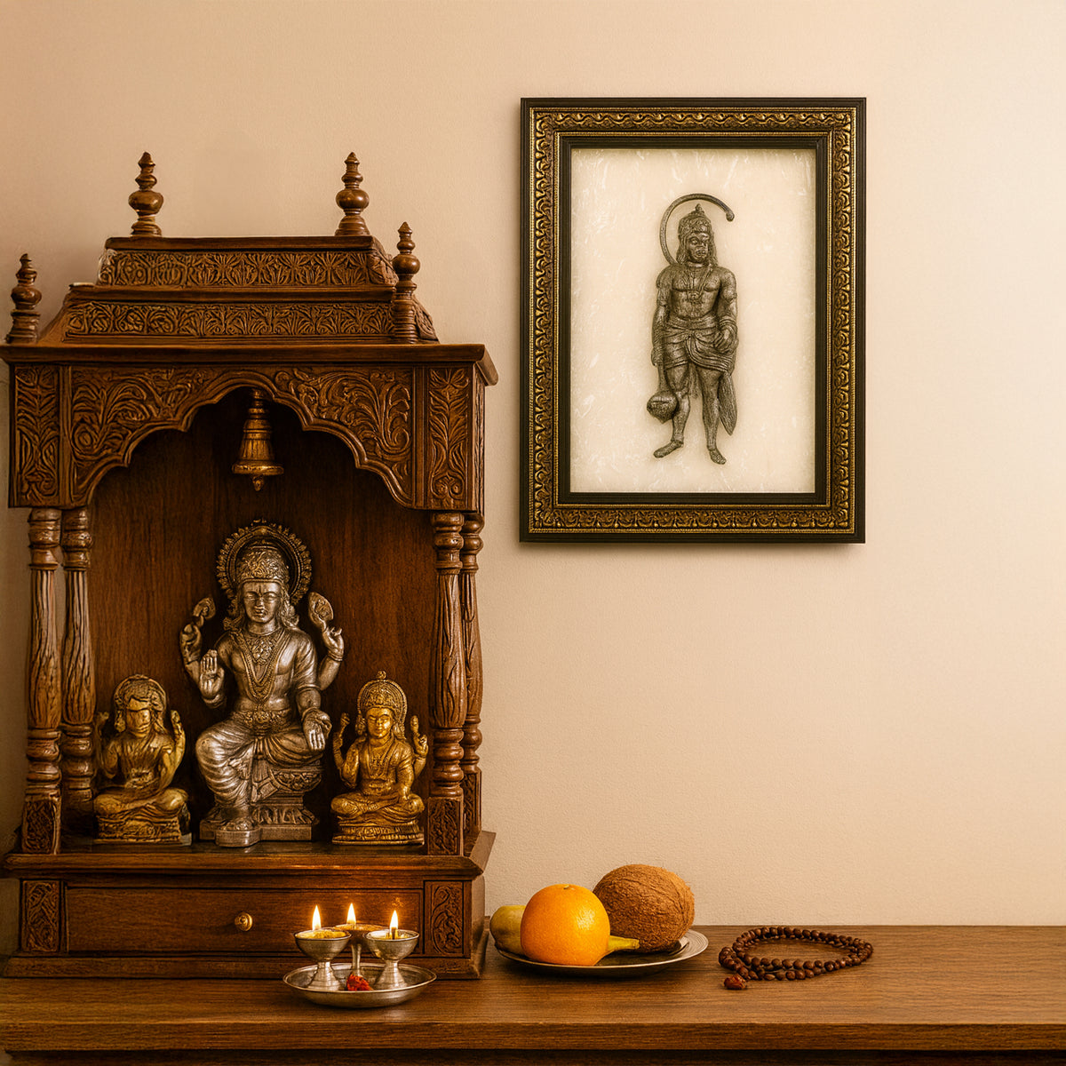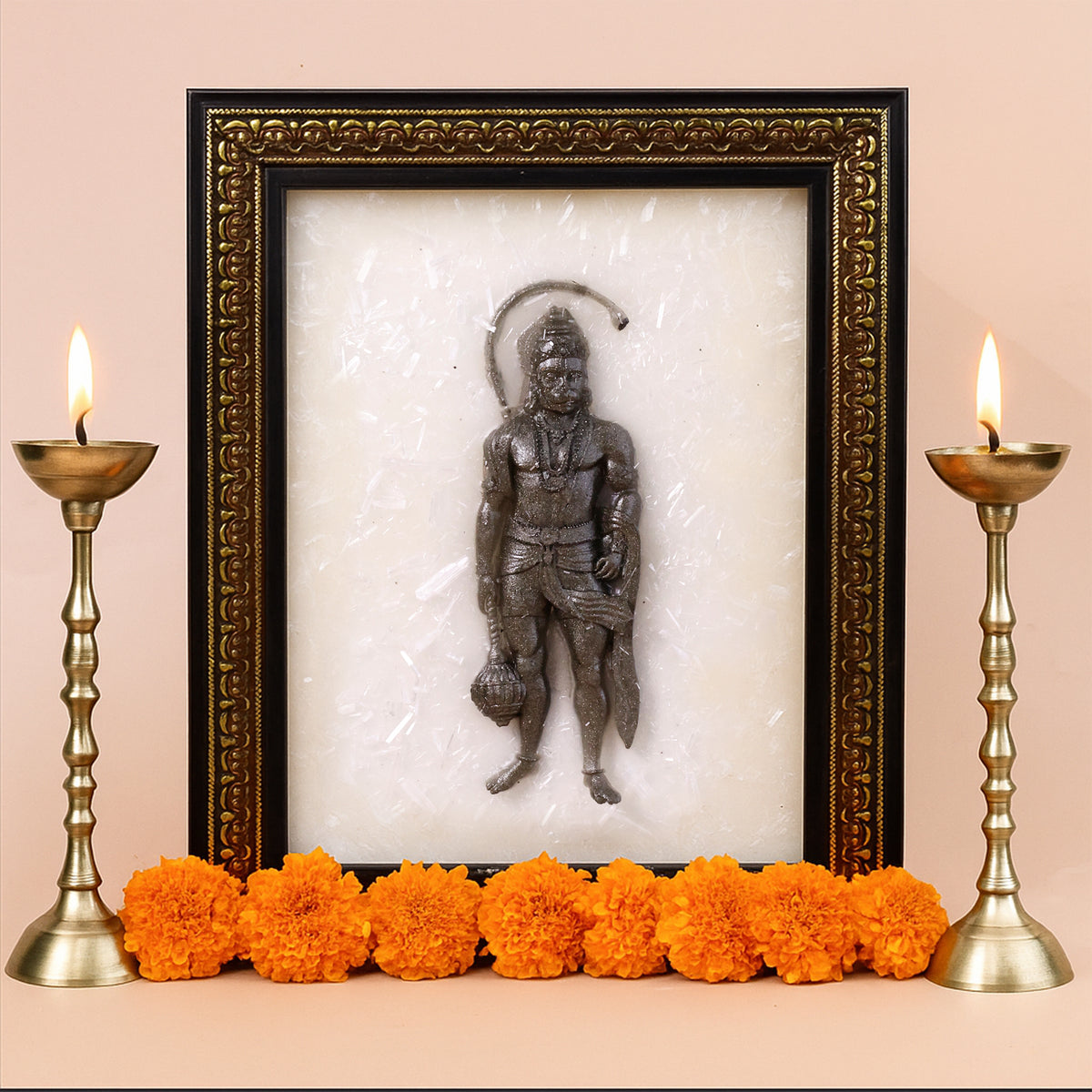 Placing this frame invokes Lord Hanuman’s blessings for strength, confidence and removal of obstacles. It protects from evil energies, ensures courage in challenges and promotes spiritual growth.