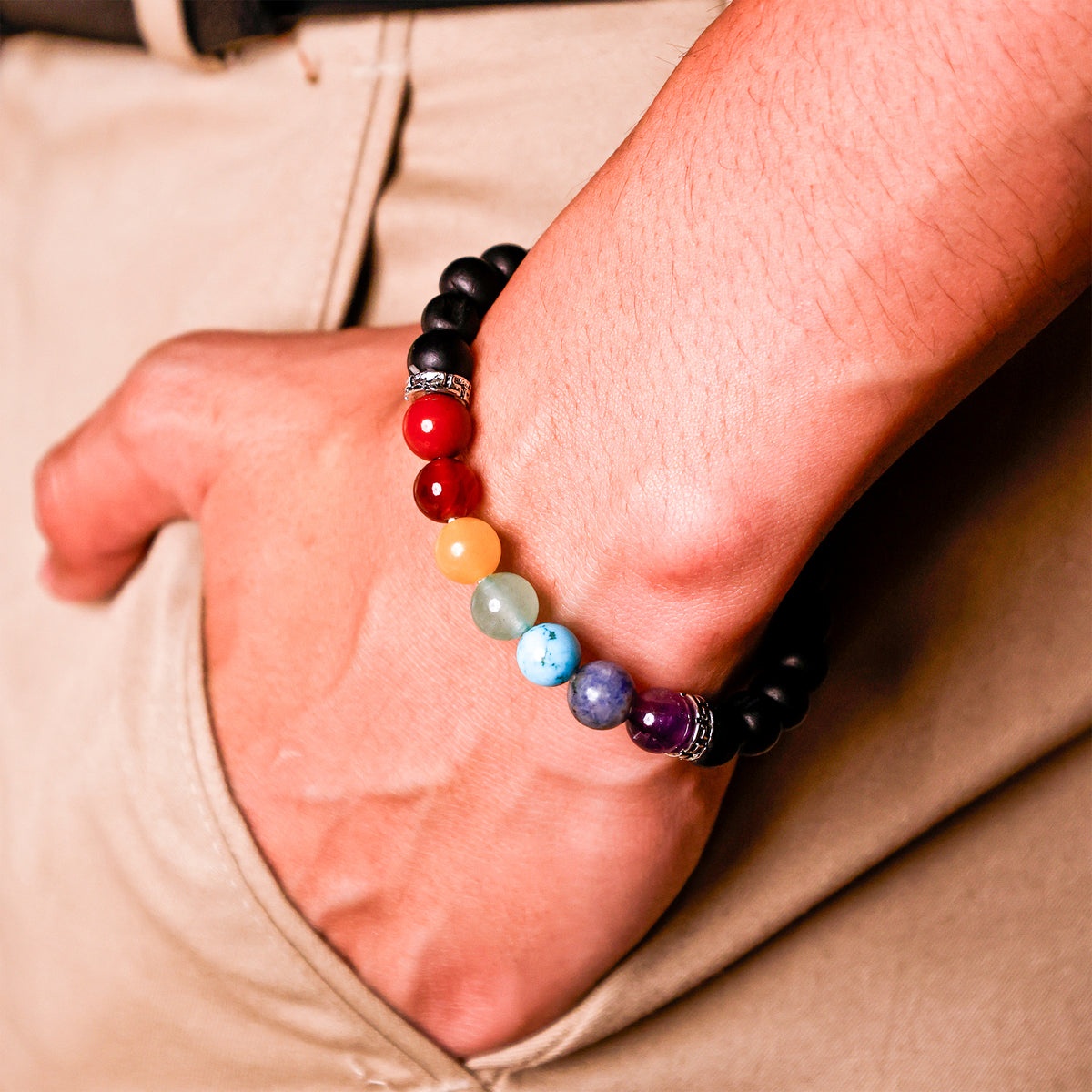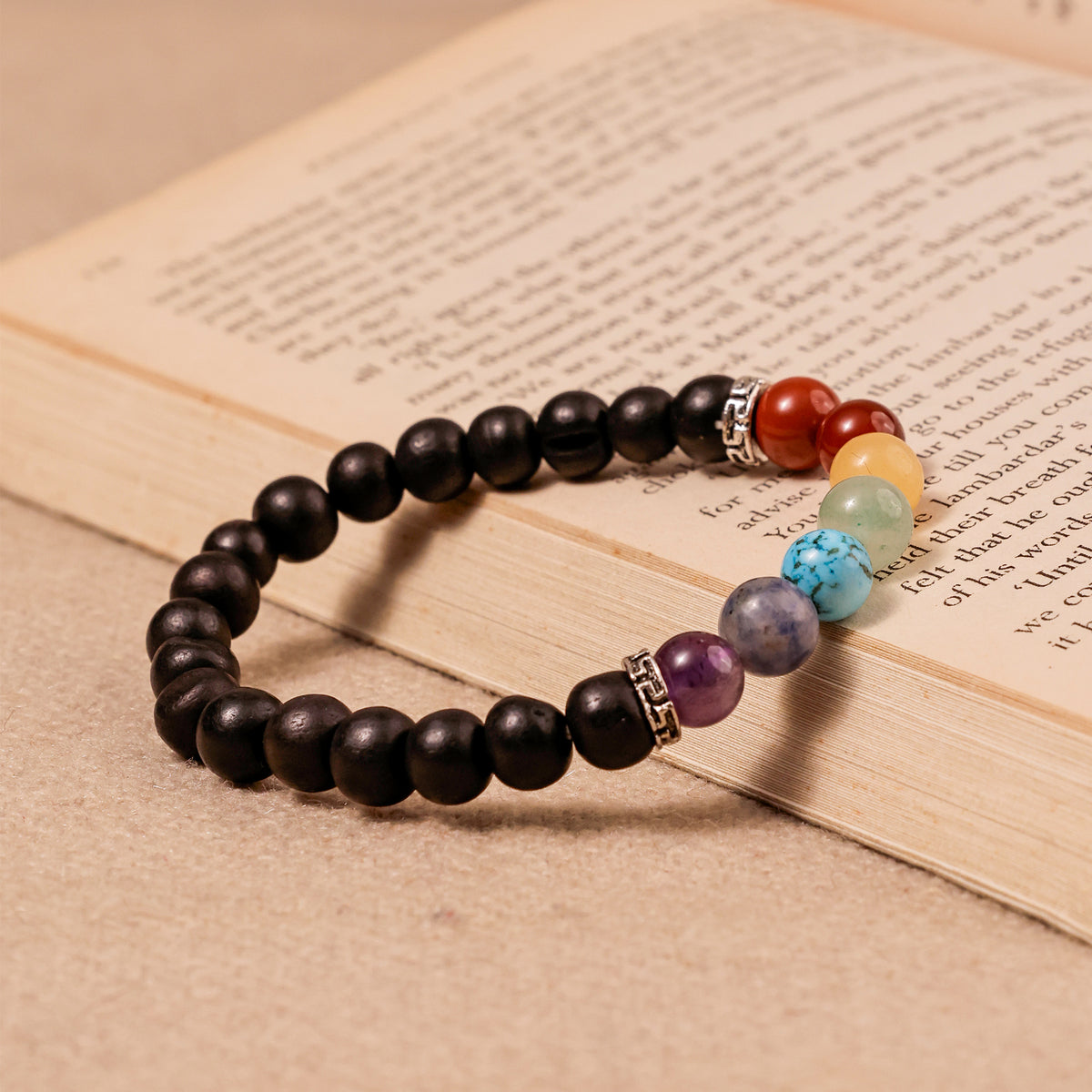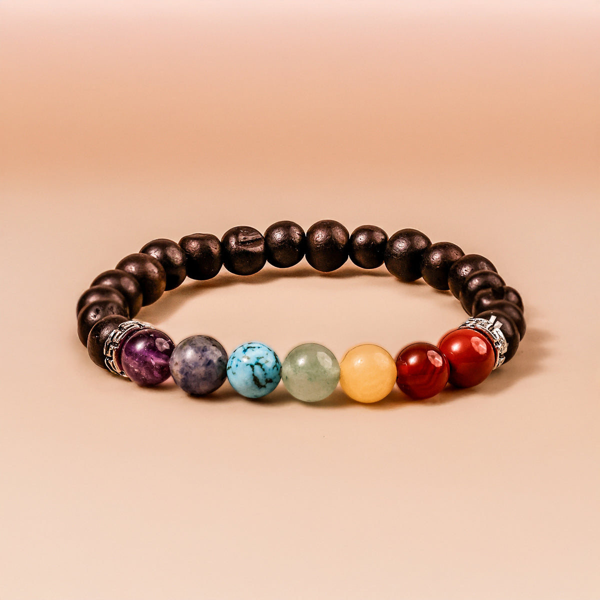 This Karungali With 7 Chakra Bracelet, made from sacred Karungali wood and seven chakra stones. It is a powerful spiritual accessory for balance, protection and inner strength. Karungali wood neutralizes negativity, keeps us away from evil energies and draws in divine blessings. Seven Chakra stones balance the energy centers of the body beginning with Muladhara (Root Chakra) right up to Sahasrara (Crown Chakra).