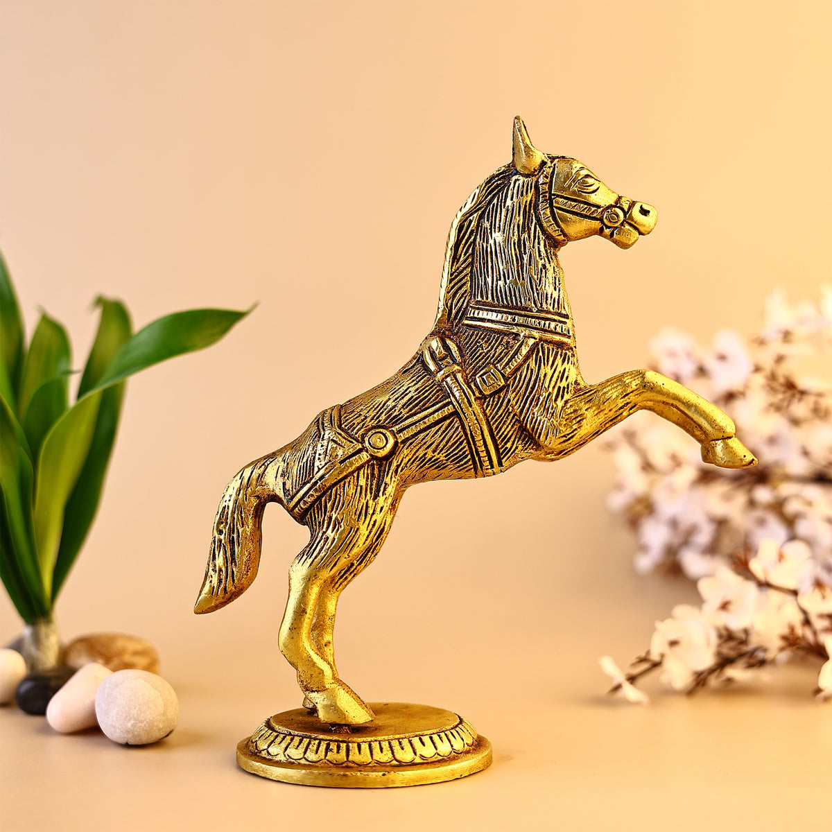 Blessed with powerful Vedic mantras, the Brass Horse Statue attracts success, courage, and good fortune. Keep it in your space to invite strength, determination, and positive energy into your life.