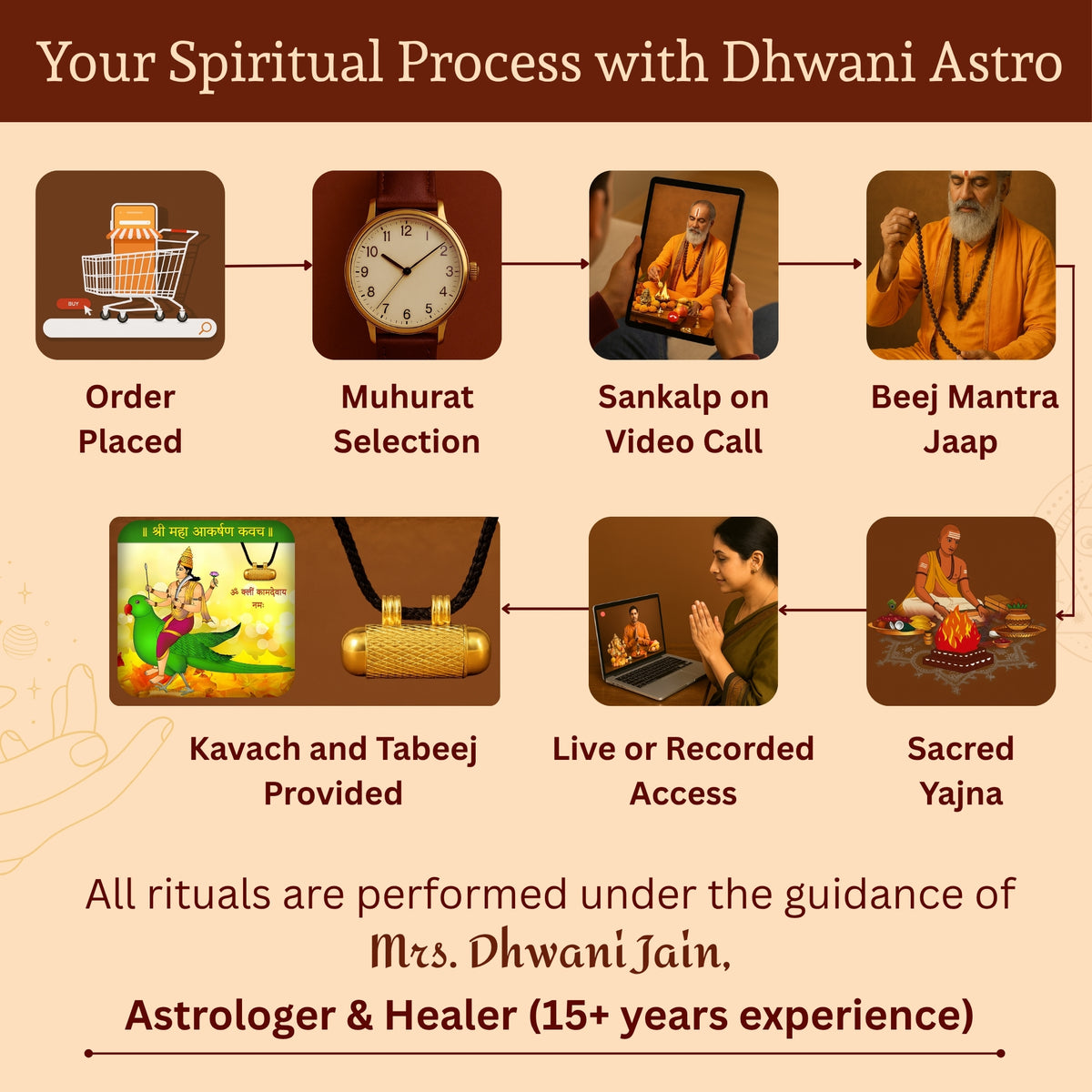 At Dhwani Astro, we believe in providing a personalized experience for each customer. Once you make a purchase, we first confirm all your details to ensure accuracy. Our expert astrologer carefully cleanses your products and then energizes each product according to your specific information like Name, Gotra, and Date of Birth, ensuring it aligns with your spiritual needs.