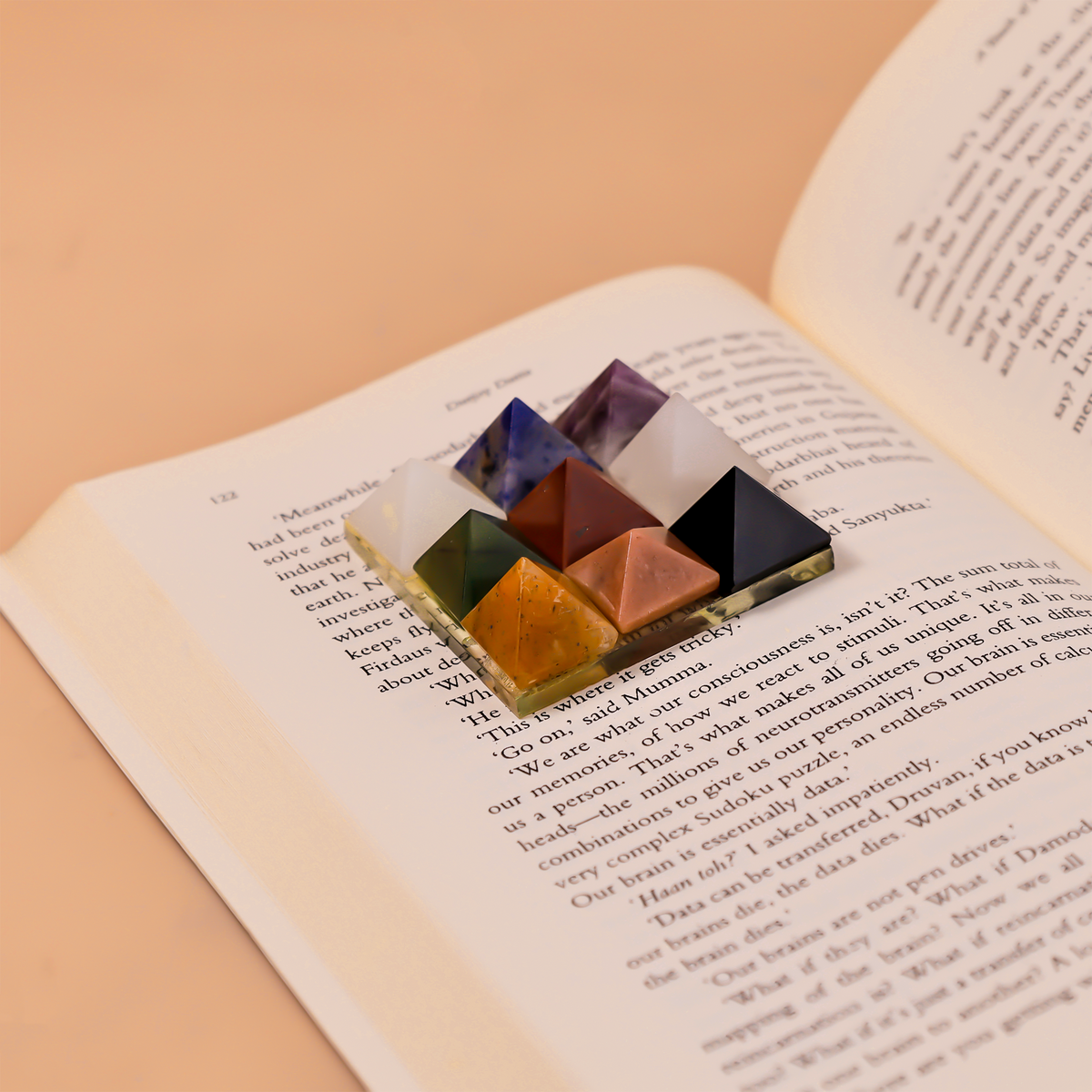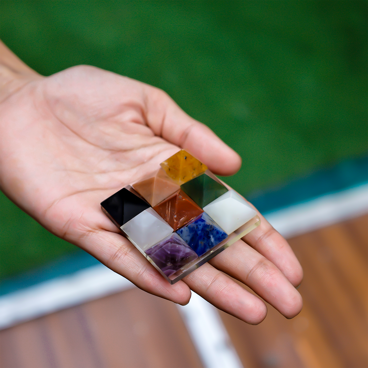 Immerse yourself in the harmonious energy of our Natural Seven Chakra Pyramid Yantra, meticulously abhimantrit by expert pandits to amplify its spiritual potency and efficacy.