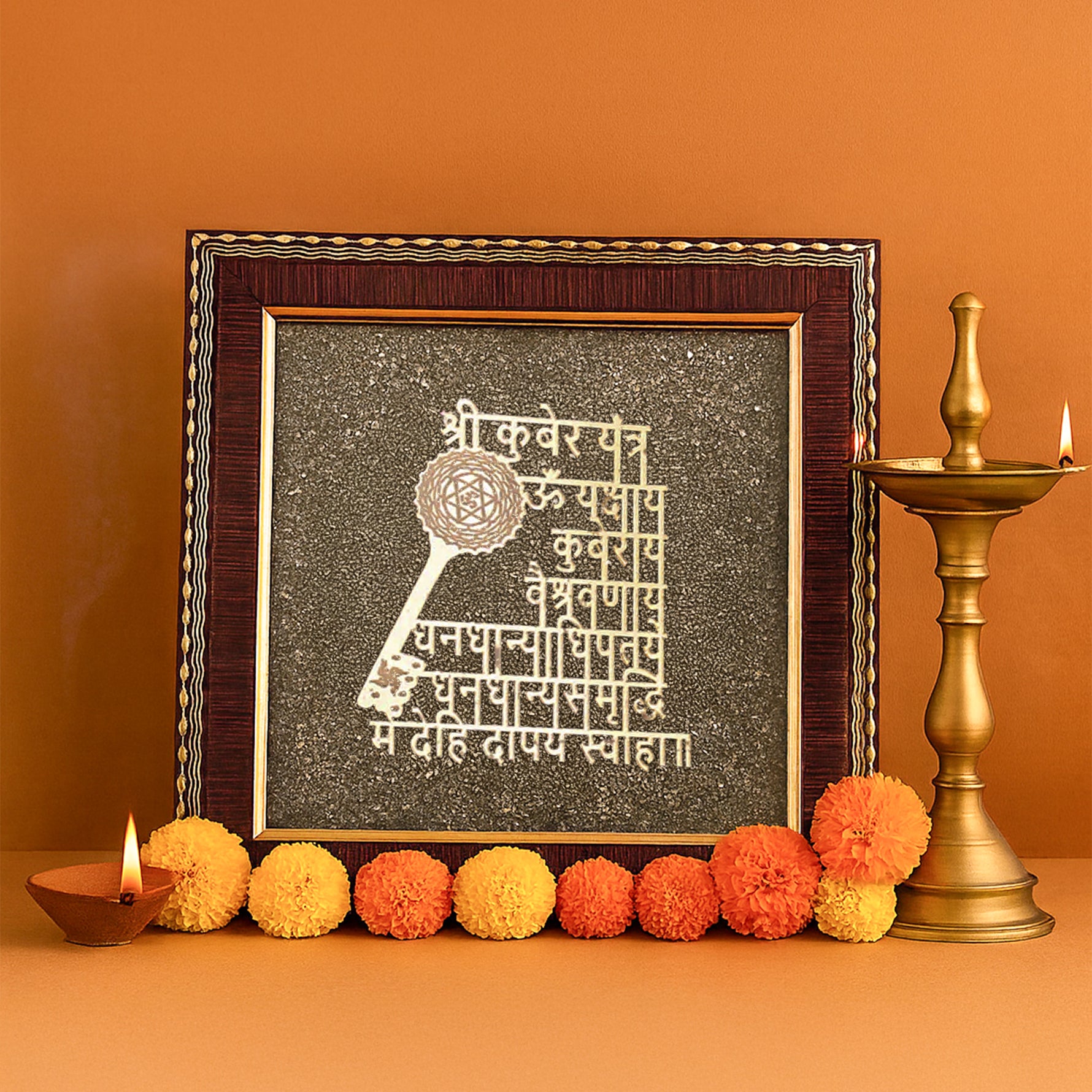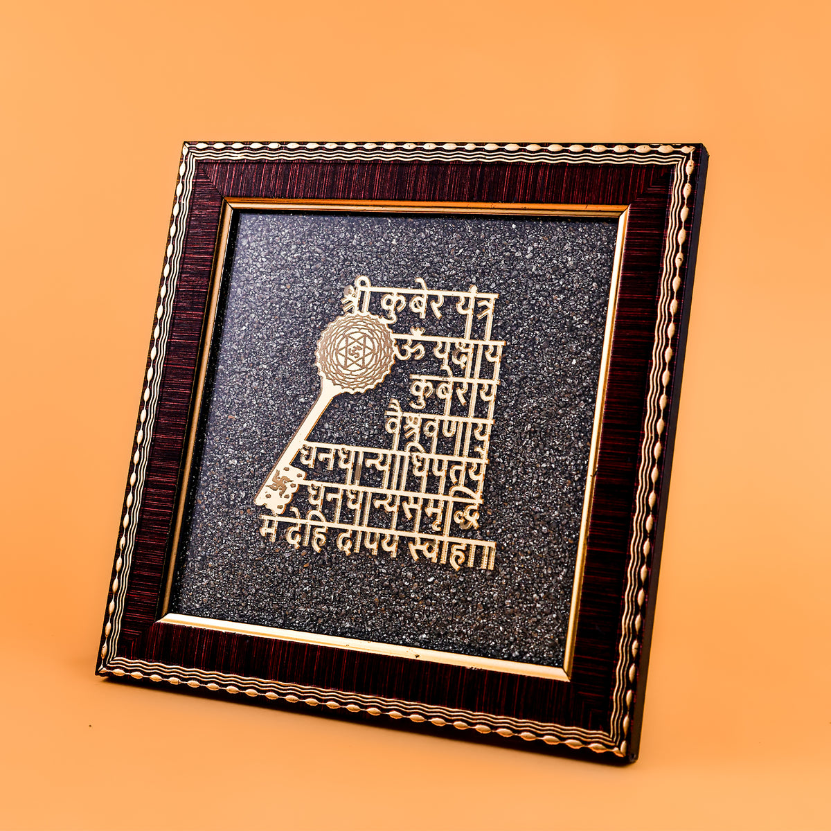 Shree Kuber Mantra and Yantra Raw Pyrite Frame is a powerful and sacred frame dedicated to Lord Kuber, the God of wealth, prosperity, and treasures. Lord Kuber is the divine treasurer of the universe and His blessings ensure financial stability, growth in business, and abundance in life. The combination of Kuber Yantra and Kuber Mantra amplifies the positive vibrations, attracting fortune, opportunities, and success.