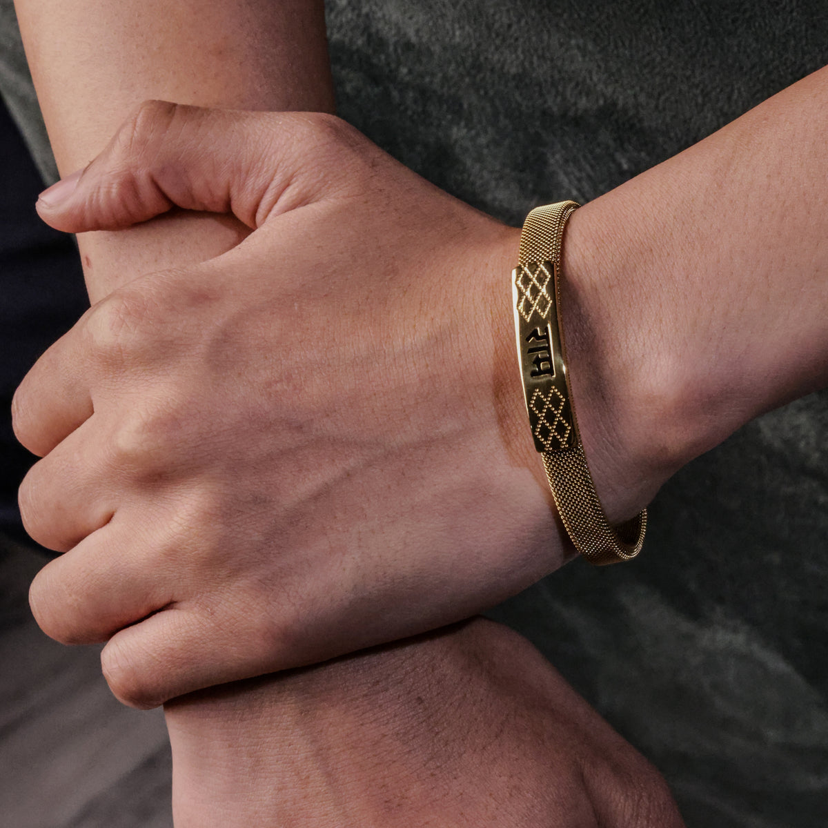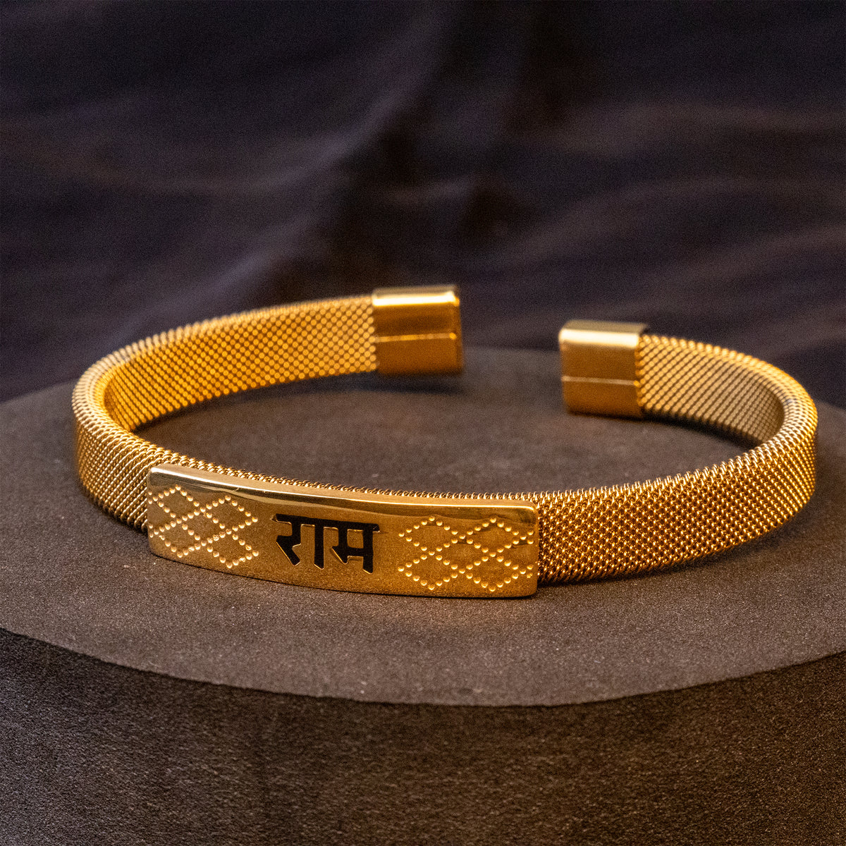 The design is powerful yet simple — with a golden plate showing Ram in bold letters and beautiful patterns on both sides. It looks elegant and feels strong on your wrist.