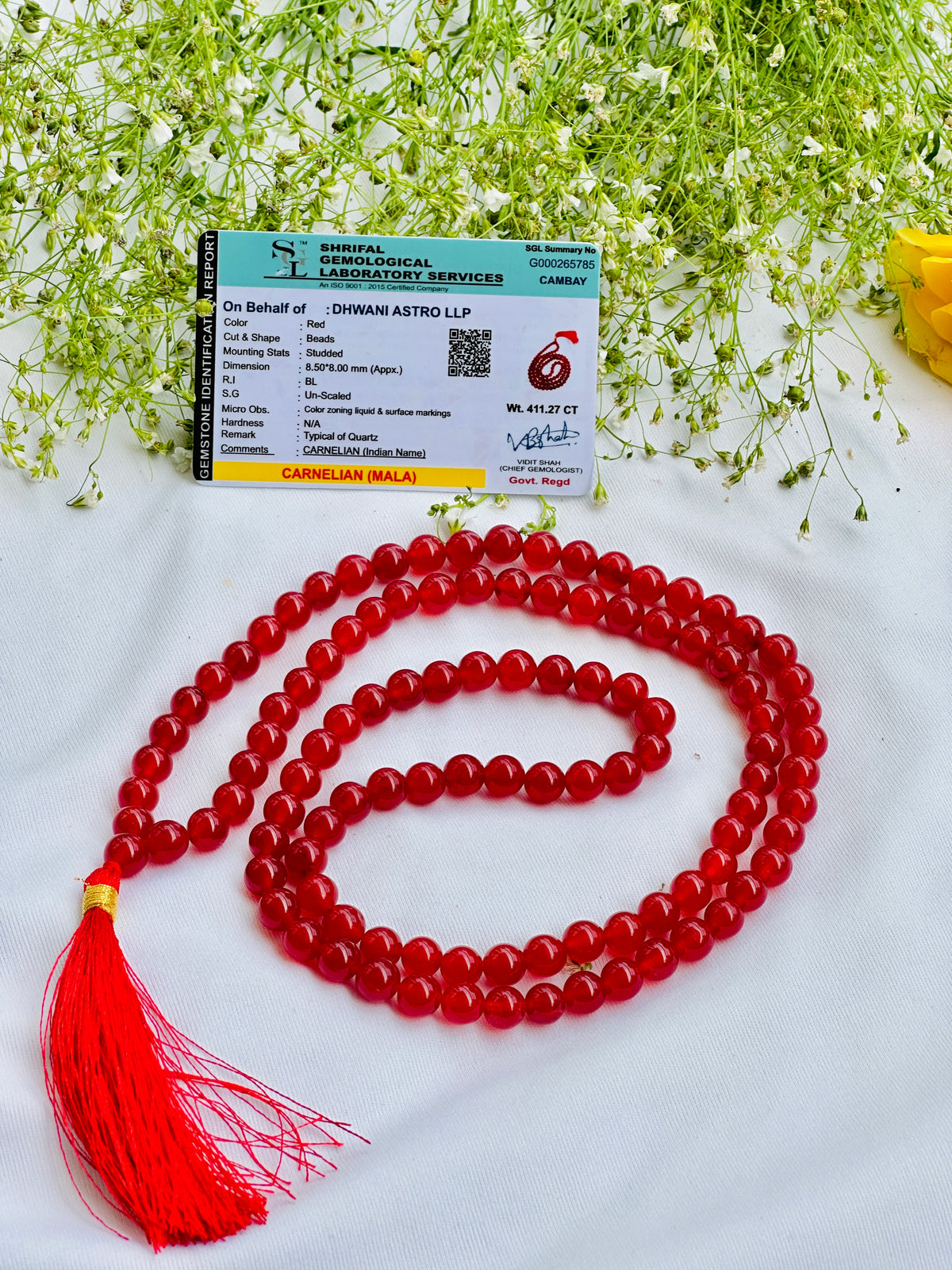 Unit price / perRed Carnelian Mala is an elegant Religious Jewelry, made from natural stones of Red Carnelian, which is famous for its bright energy and strong earthy energy. The beads in this mala are of high-end AAA quality deep red in color and clear in finish making them feel very rich. This mala is further blessed by a pandit thereby charging it with good energies and therefore aligning it with divine energies.