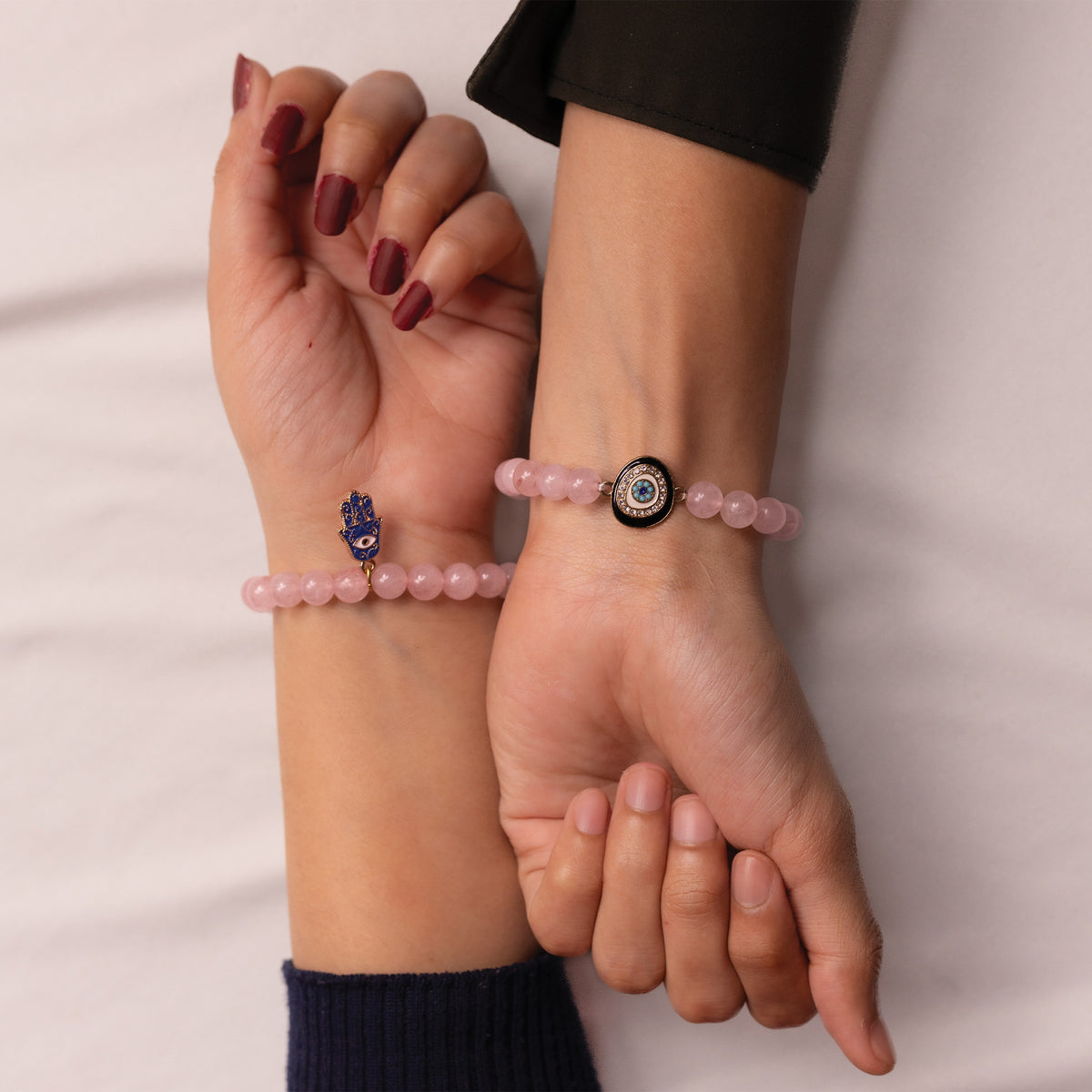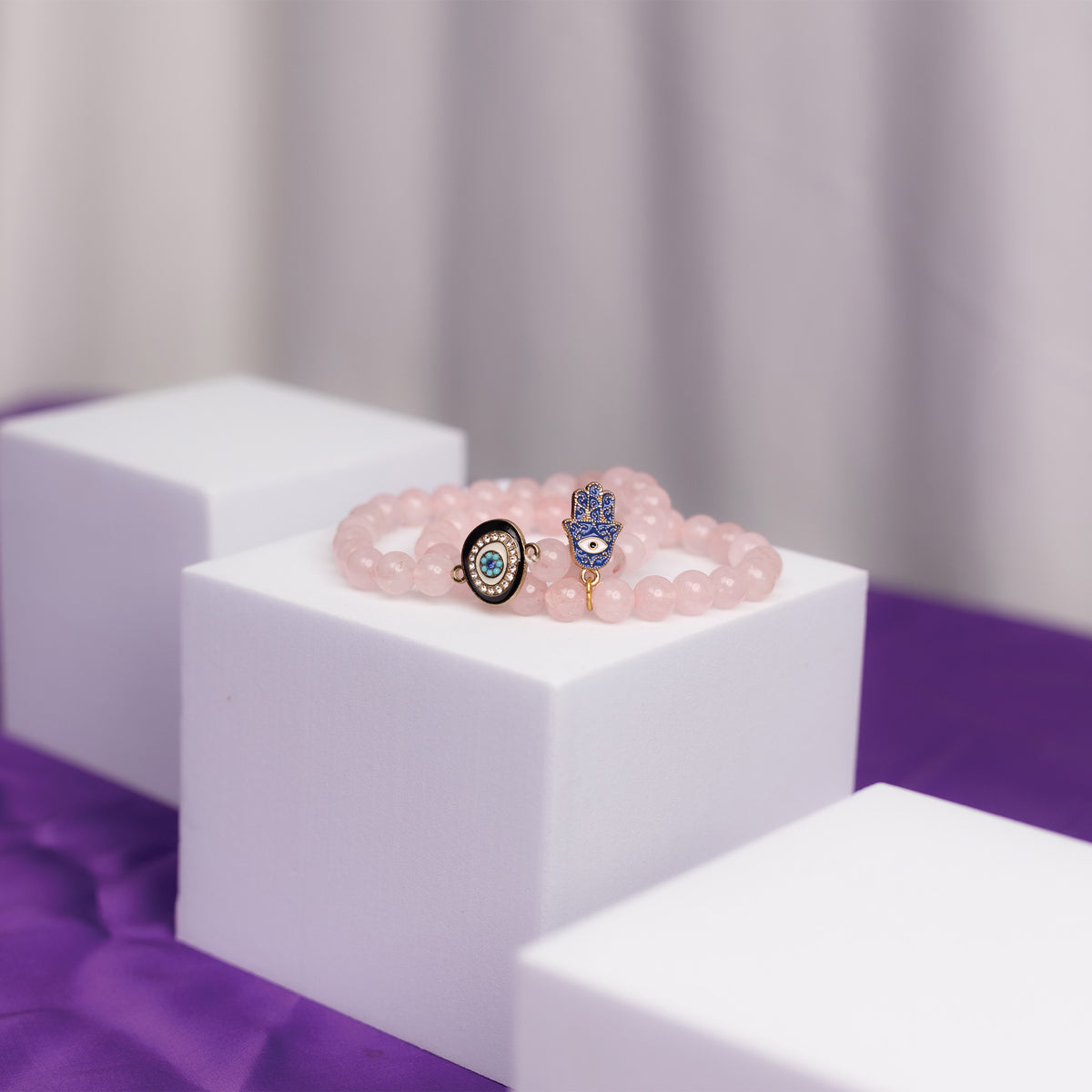Rose Quartz Bracelet with Evil Eye & Hamsa Hand Charm Combo - Abhimantrit & Certified