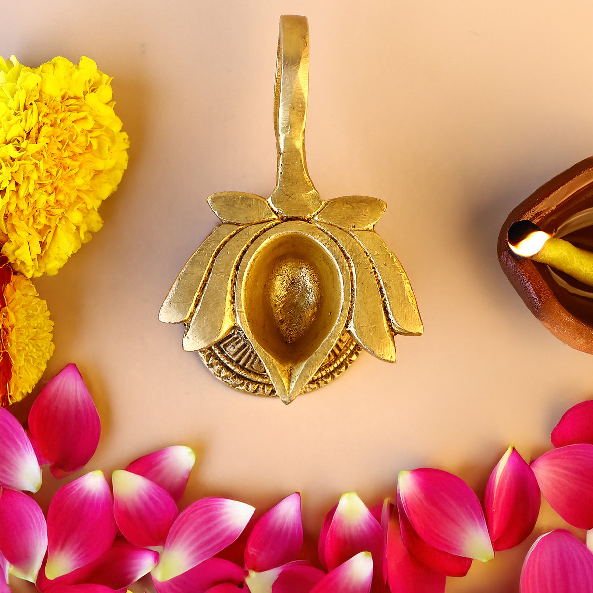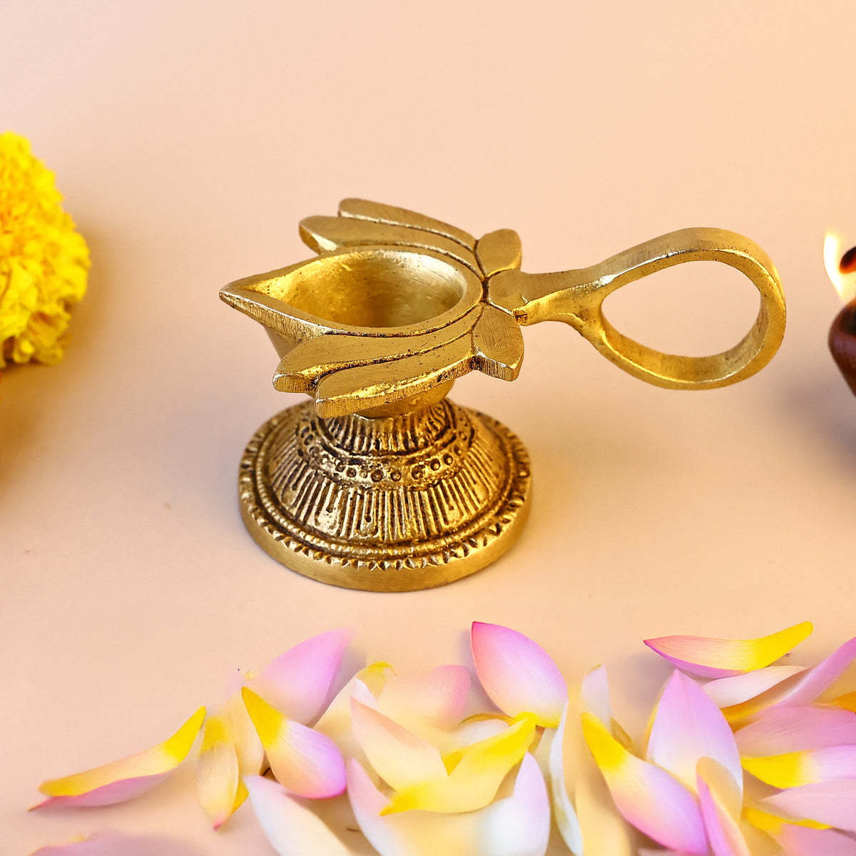 The Brass Lotus Diya With Handle is a sacred oil lamp that brings peace, positivity, and blessings. Made from pure brass, it is shaped like a lotus, which represents purity, growth, and good fortune. The handle makes it easy to hold and use safely.