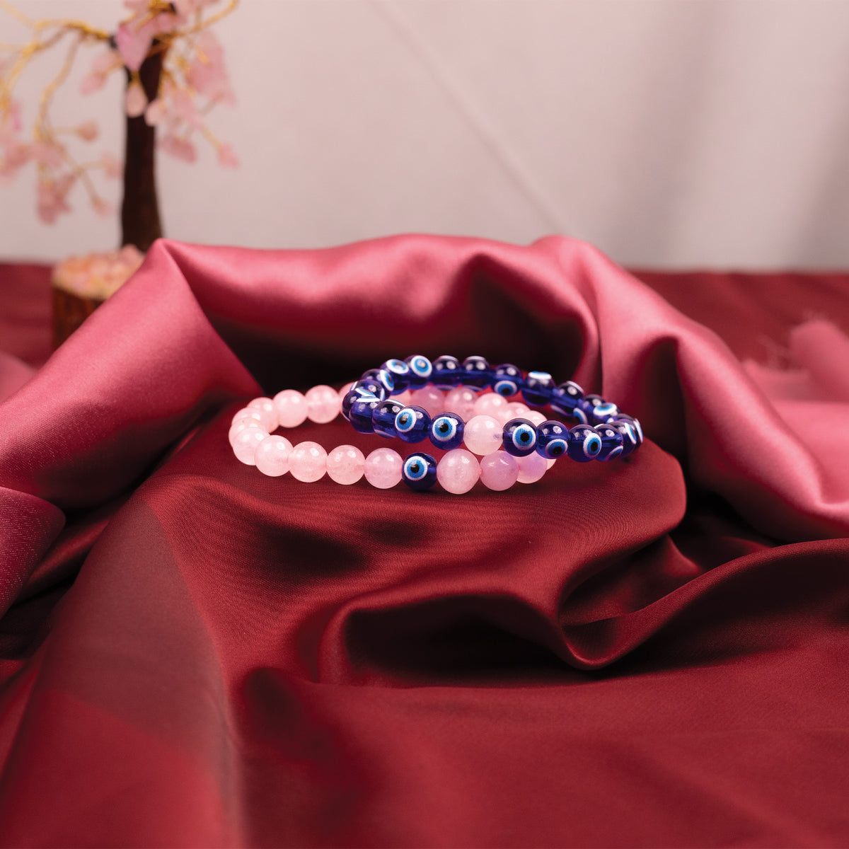 Each bracelet is Abhimantrit with your name and gotra by expert pandits through a special Sankalp, making them spiritually powerful. One bracelet has more Rose Quartz with a single Evil Eye bead, representing love with protection, while the other has more Evil Eye beads with a single Rose Quartz bead, symbolizing protection with love. Wearing them together helps maintain a balance of emotional strength and spiritual security.