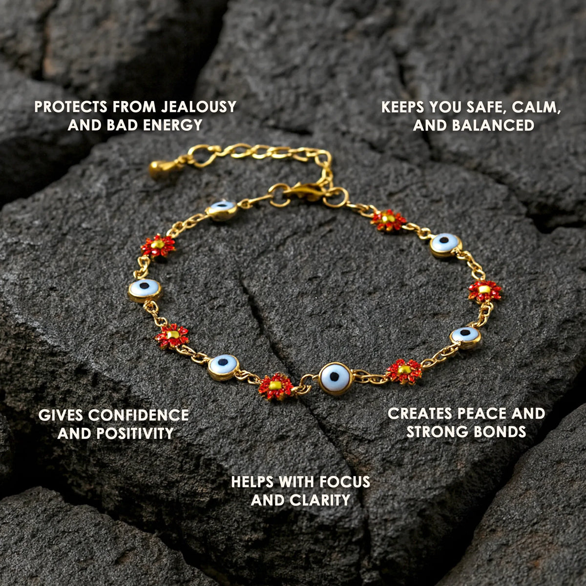 This beautiful Evil Eye With Flower Anklet brings together style and protection. The mix of blue evil eyes and pretty flower charms keeps away negativity and fills your life with happiness and good vibes. The blue eyes protect you from bad energy and jealousy, while the flowers stand for joy, freshness, and growth.