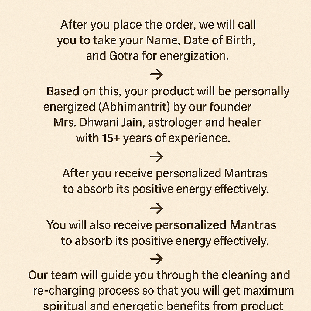 At Dhwani Astro, we believe in providing a personalized experience for each customer. Once you make a purchase, we first confirm all your details to ensure accuracy. Our expert astrologer carefully cleanses your products and then energizes each product according to your specific information like Name, Gotra, and Date of Birth, ensuring it aligns with your spiritual needs.