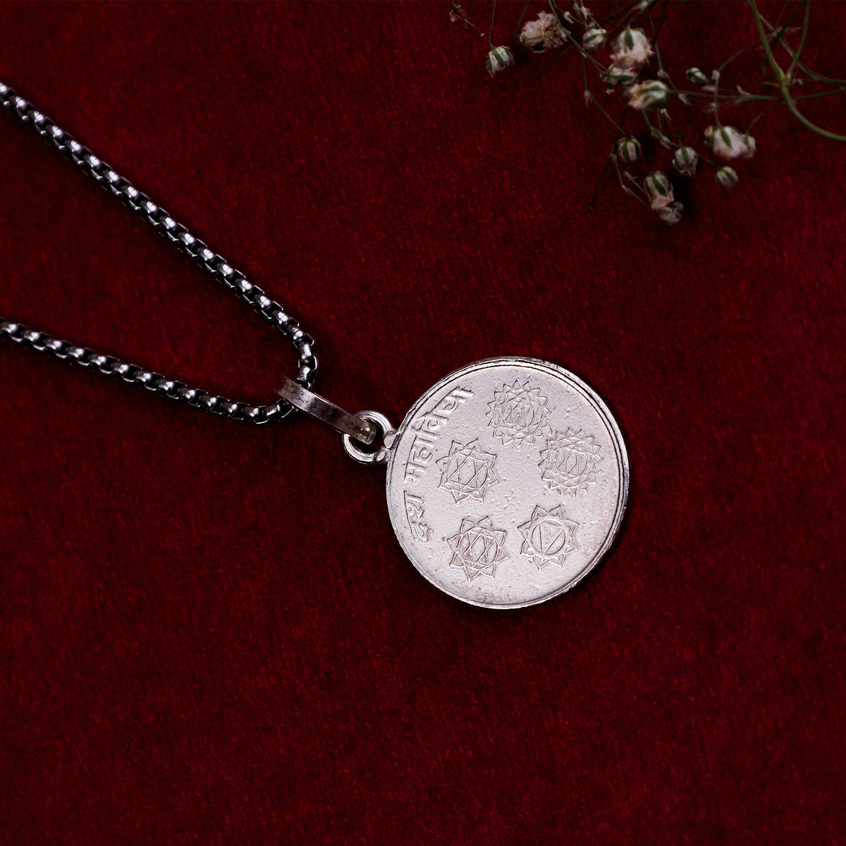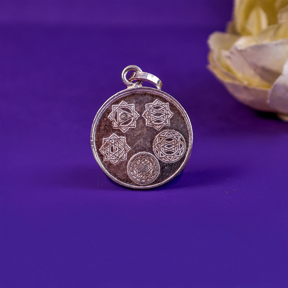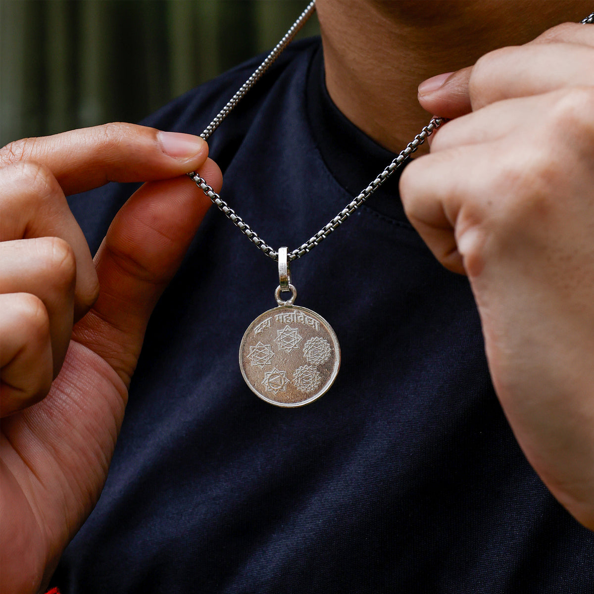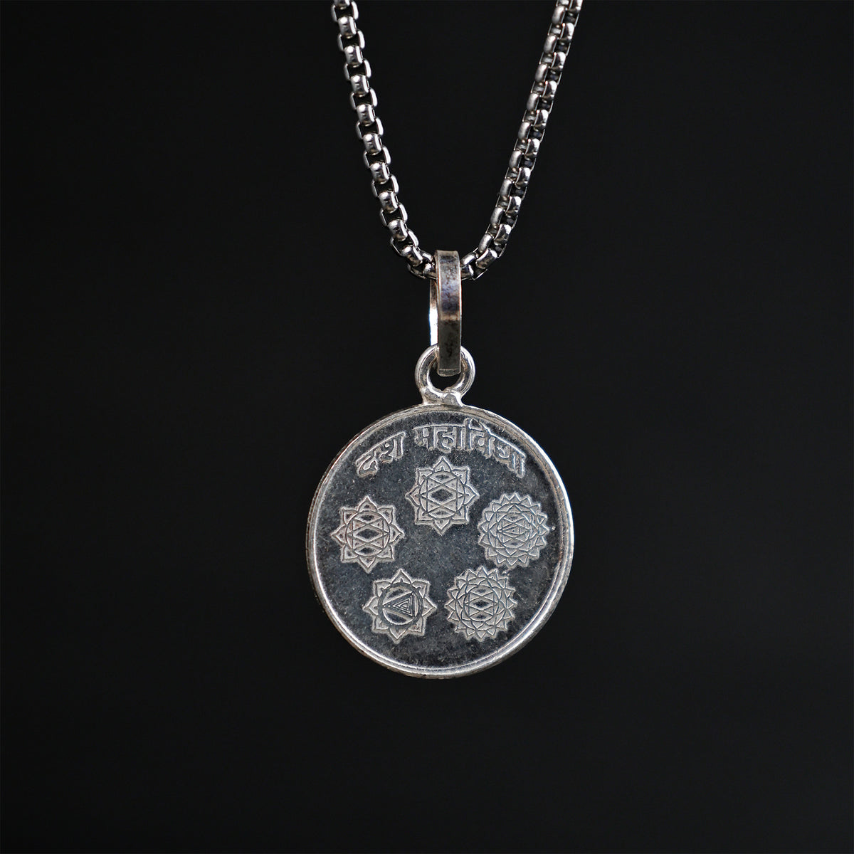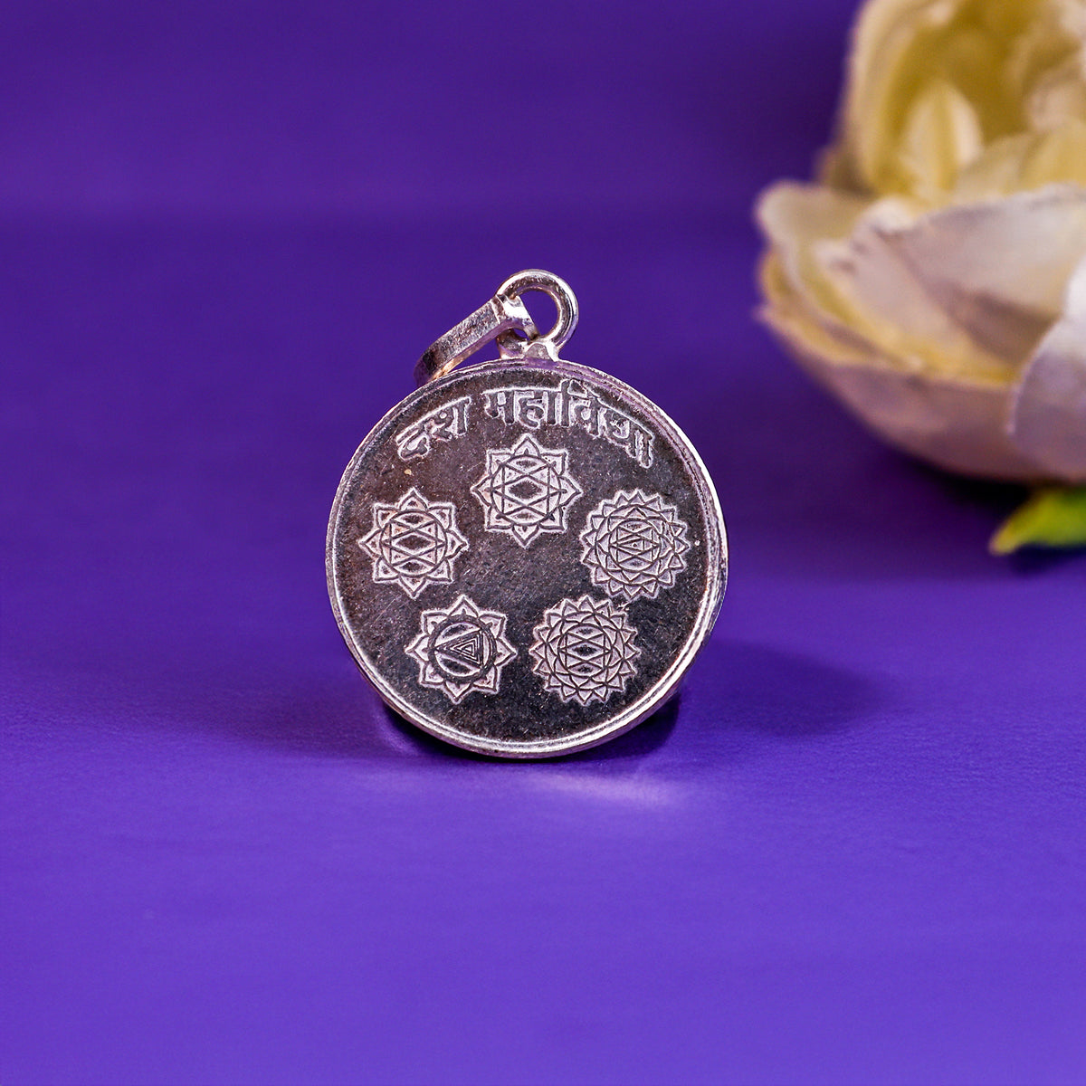 This Dasha Mahavidya Yantra Pendant is made with pure silver and it symbolizes the auspicious presence of Ten Mahavidyas (ten incarnations of the Divine Mother). Each Mahavidya has a special cosmic power that eliminates all obstacles, introduces wisdom, fulfills desires and wins the devotee against evil forces and energies.