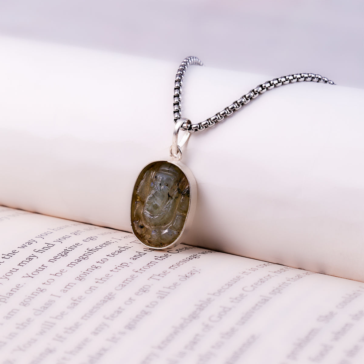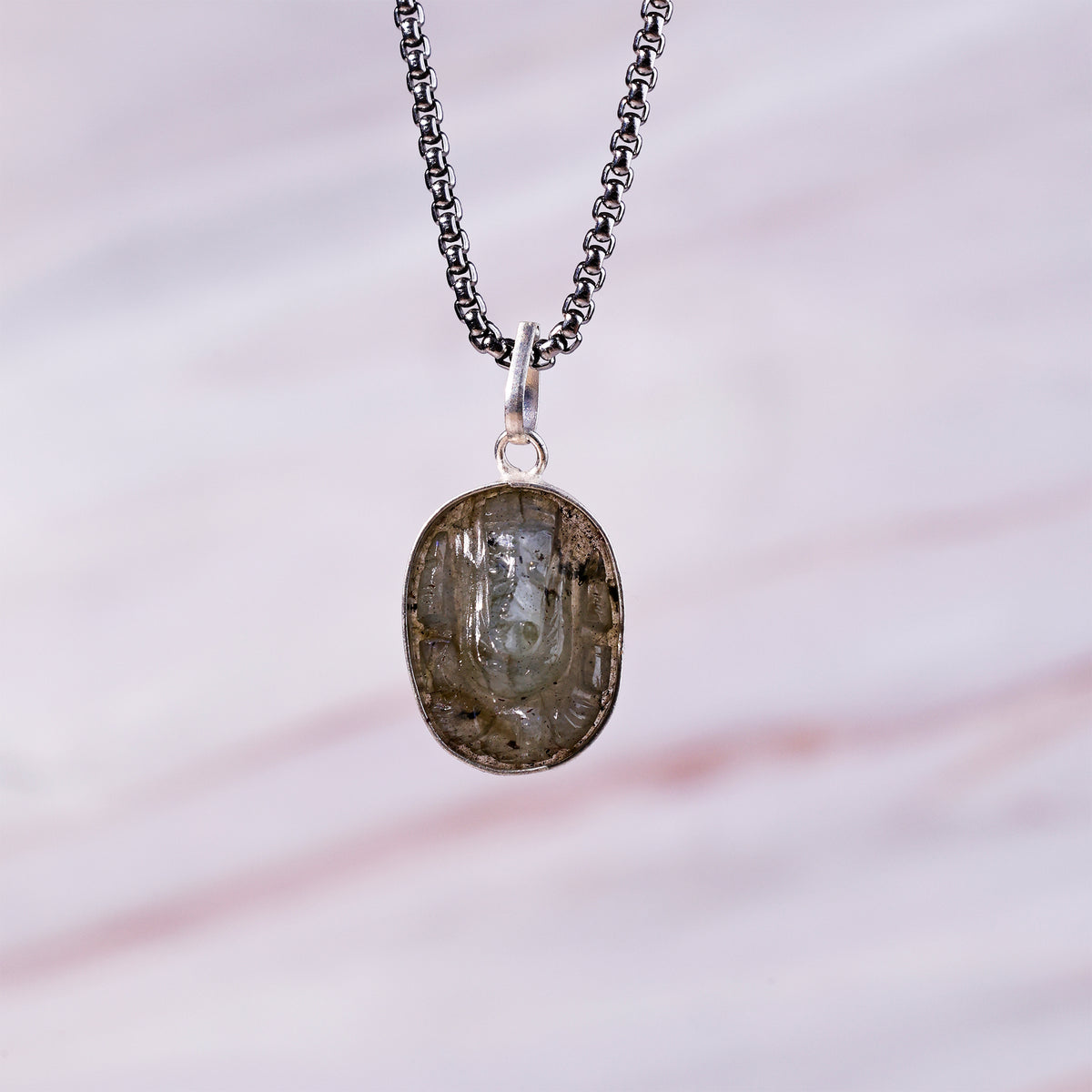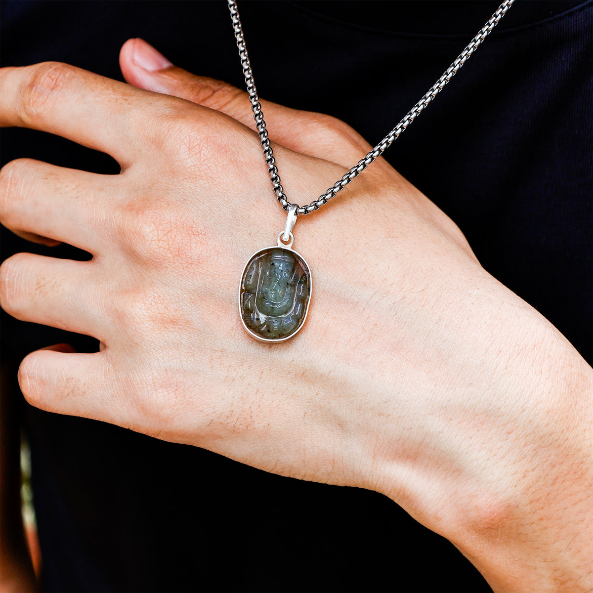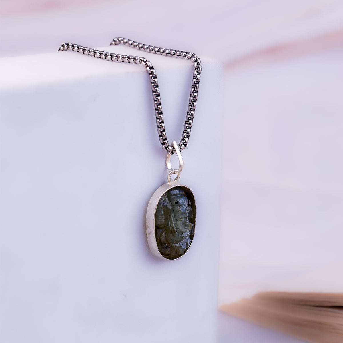 The Labradorite stone protects from negativity, evil eye, and stress. It also awakens inner strength, boosts intuition, and brings clarity of mind. Lord Ganesha helps in removing problems, attracting success, and blessing you with peace and prosperity. Wearing this pendant gives you both divine protection and powerful energy in life.