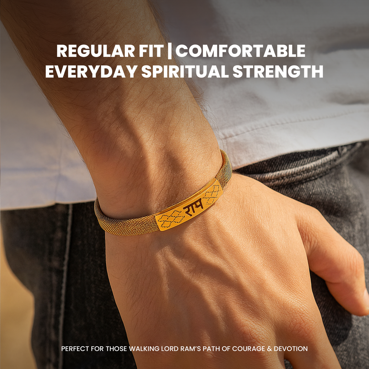 The design is powerful yet simple — with a golden plate showing Ram in bold letters and beautiful patterns on both sides. It looks elegant and feels strong on your wrist.