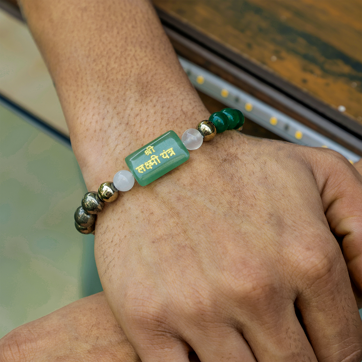 At its center lies a beautiful Green Avanturine stone engraved with the sacred Shri Laxmi Yantra (श्री लक्ष्मी यंत्र).