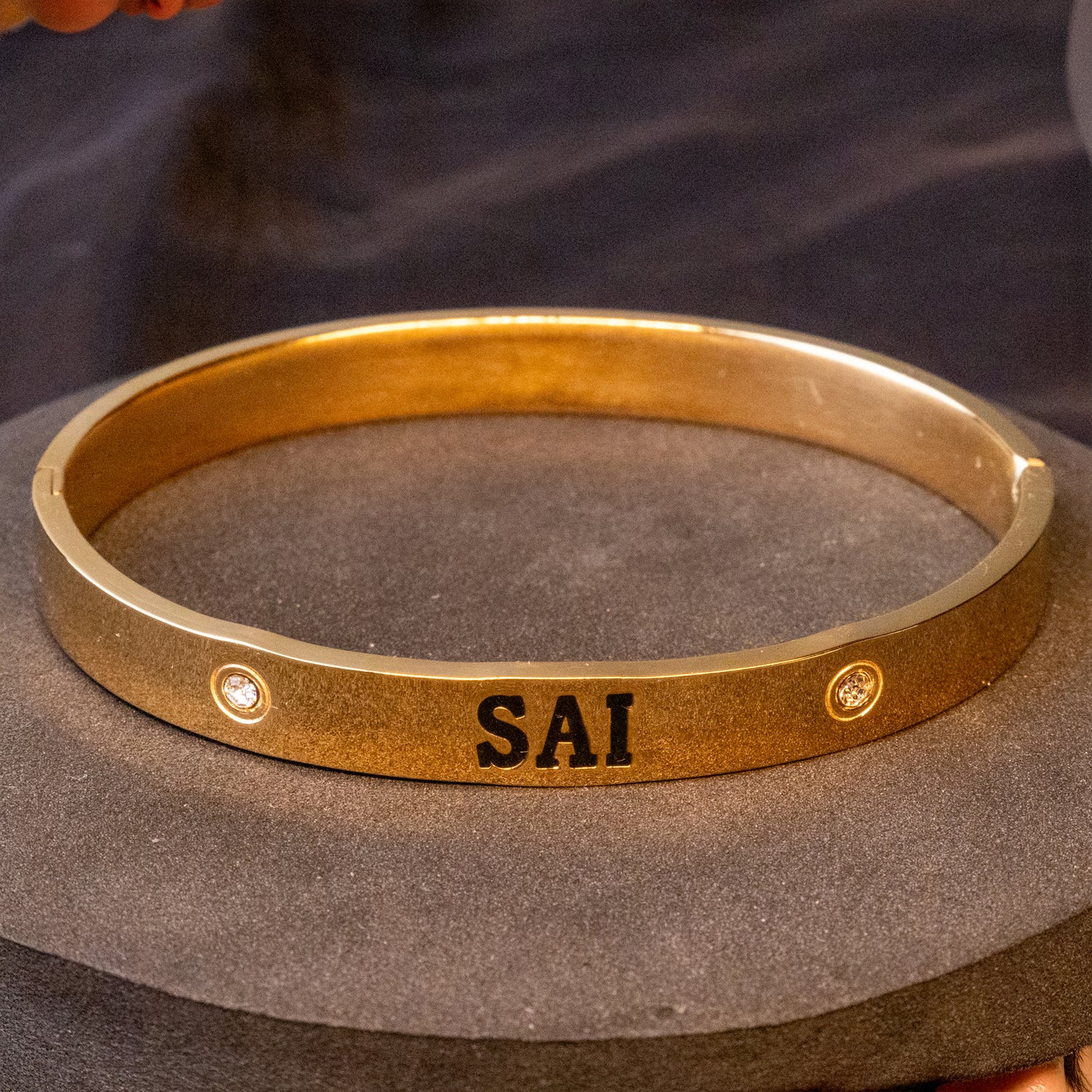 The design is simple and strong – shiny gold polish with “SAI” clearly written and two small stones on each side. It looks nice for daily wear and has deep meaning.