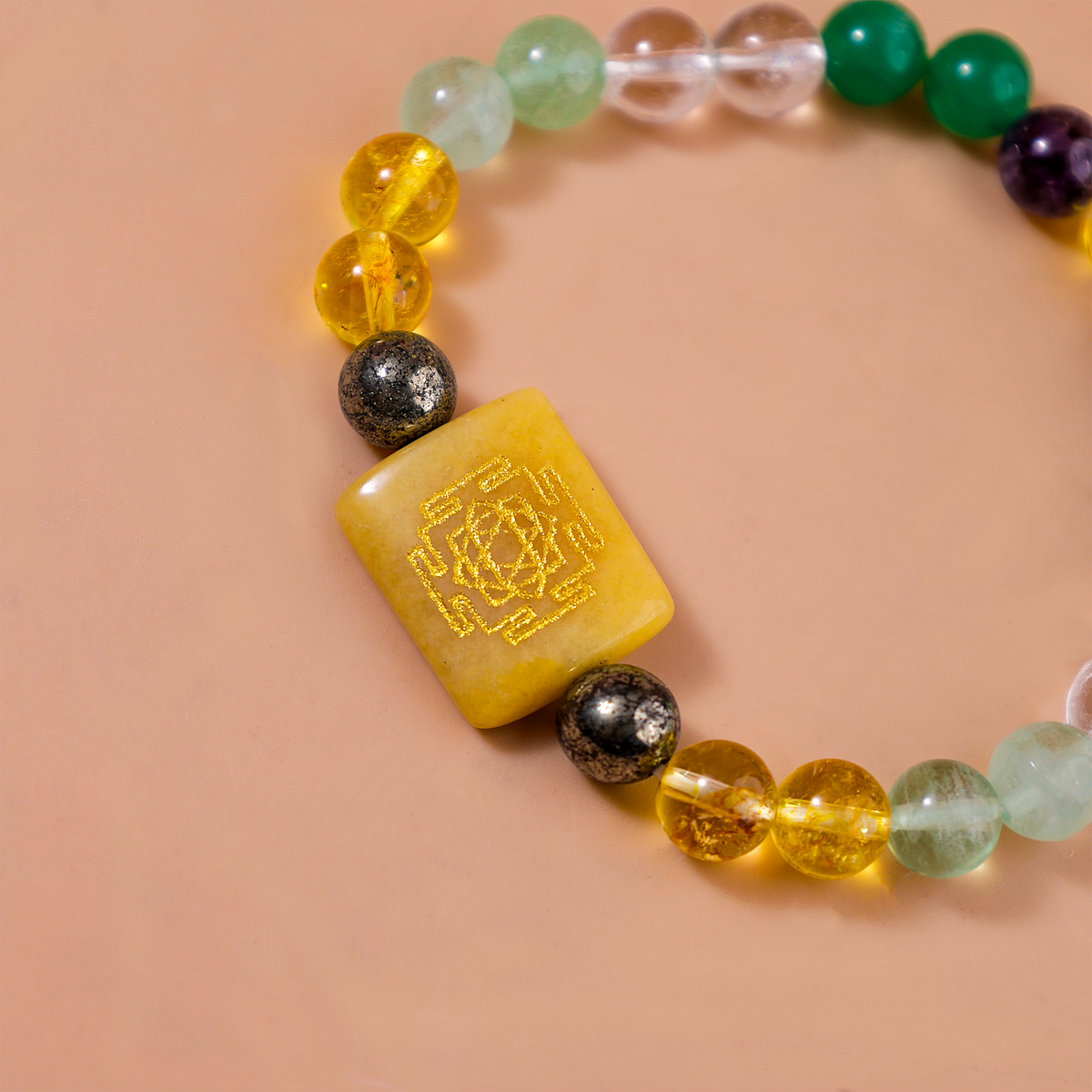 At the heart of this bracelet lies a beautiful golden-yellow stone engraved with the Saraswati Yantra 🕉️. This sacred symbol removes confusion and negativity, filling your mind with clarity, peace, and divine wisdom. It guides you toward self-confidence and success in your studies, career, and personal growth.