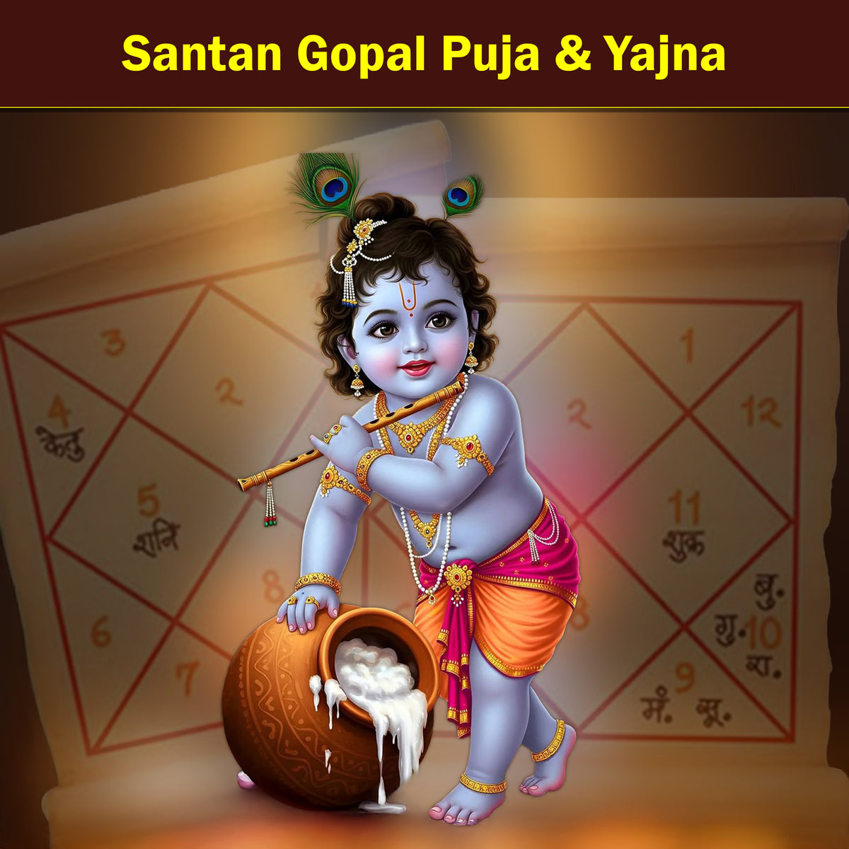 The Santan Gopal Puja & Yajna is a sacred Vedic ritual dedicated to Lord Krishna in his child form, Santan Gopal, revered as the divine protector of children and the ultimate bestower of parenthood. This powerful ritual is specifically designed for childless couples seeking the blessing of progeny and for ensuring safety and well-being during pregnancy.
