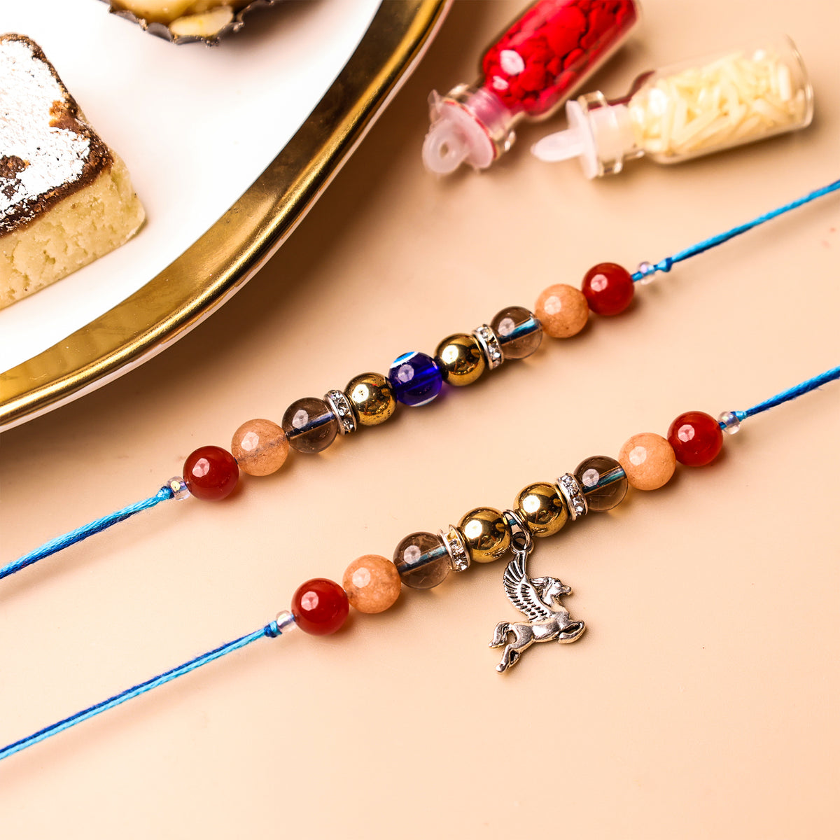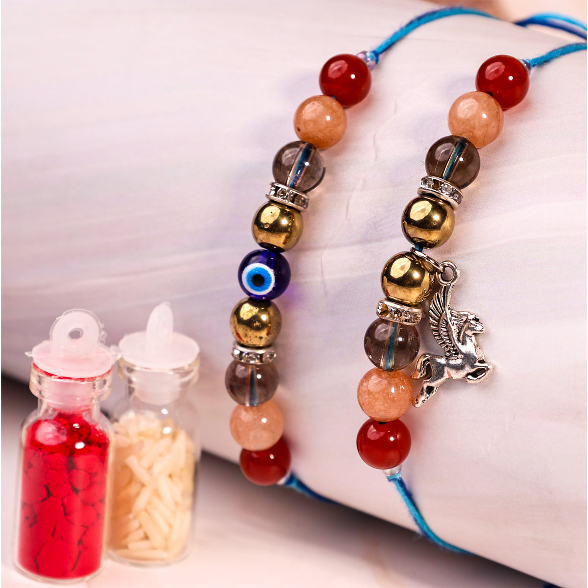 This Rakhi protects the wearer from evil eyes, bad intentions, hidden enemies, and negative surroundings. It also promotes inner strength, peace of mind, and emotional balance for your brother in all areas of life 🔱.